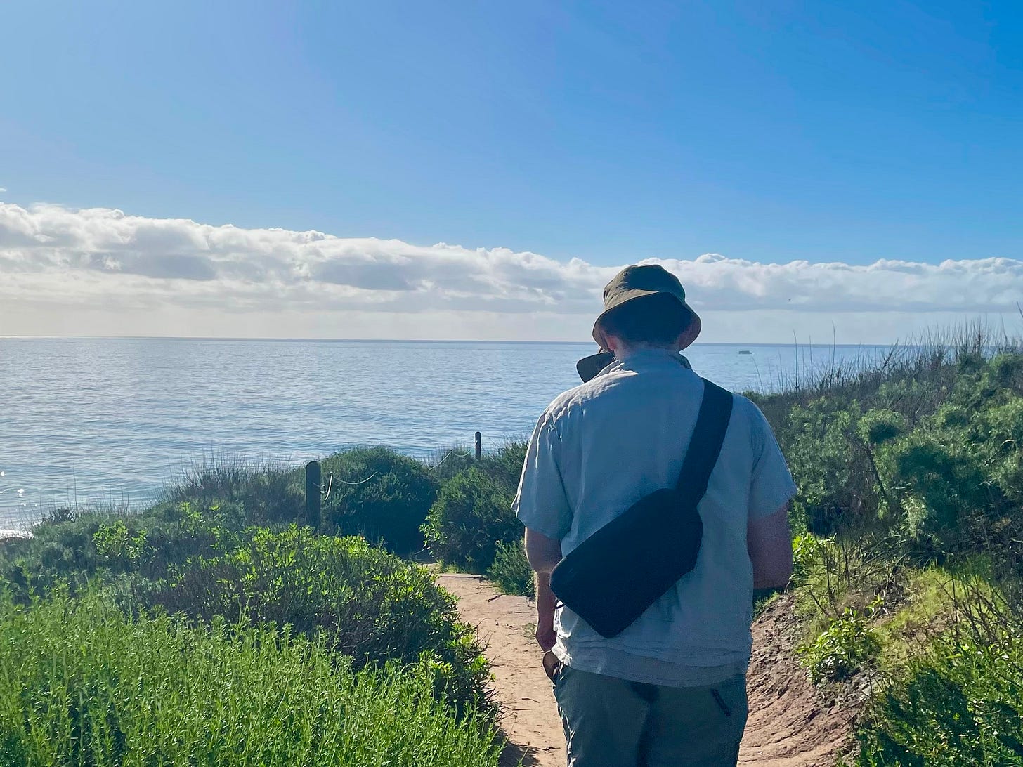 He jumped in the ocean at Crystal Cove and Seal Beach, walked to the end of the pier in Huntington, and bird watched in the Bolsa Chica Wetlands. He hiked to a point up in Silverado Canyon where he saw Catalina Island.