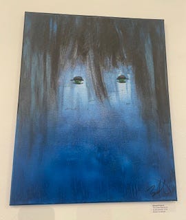The haunting blue self-portrait is by friend, artist, musician Ed Huerta and is on display now as part of the Golden West College Self/Not Selfie exhibit.