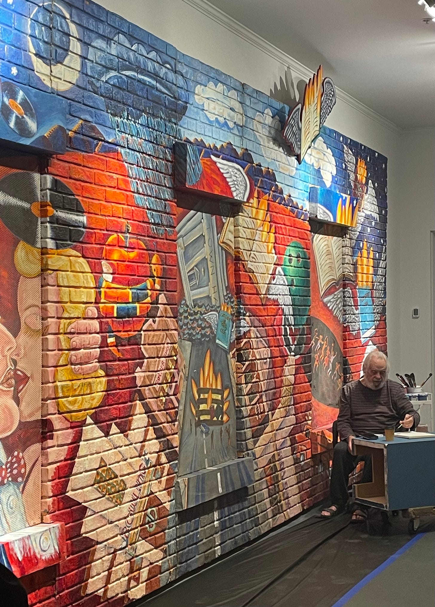 In March, MOLAA invited Frank Romero to recreate the Pleasantville mural on one of their walls. We went a couple of times to watch him work and listen to him talk about his life. Romero is one of the “Los Four” early pioneers of the Chicana/o art movement that began in the 1970s and he’s got some stories.