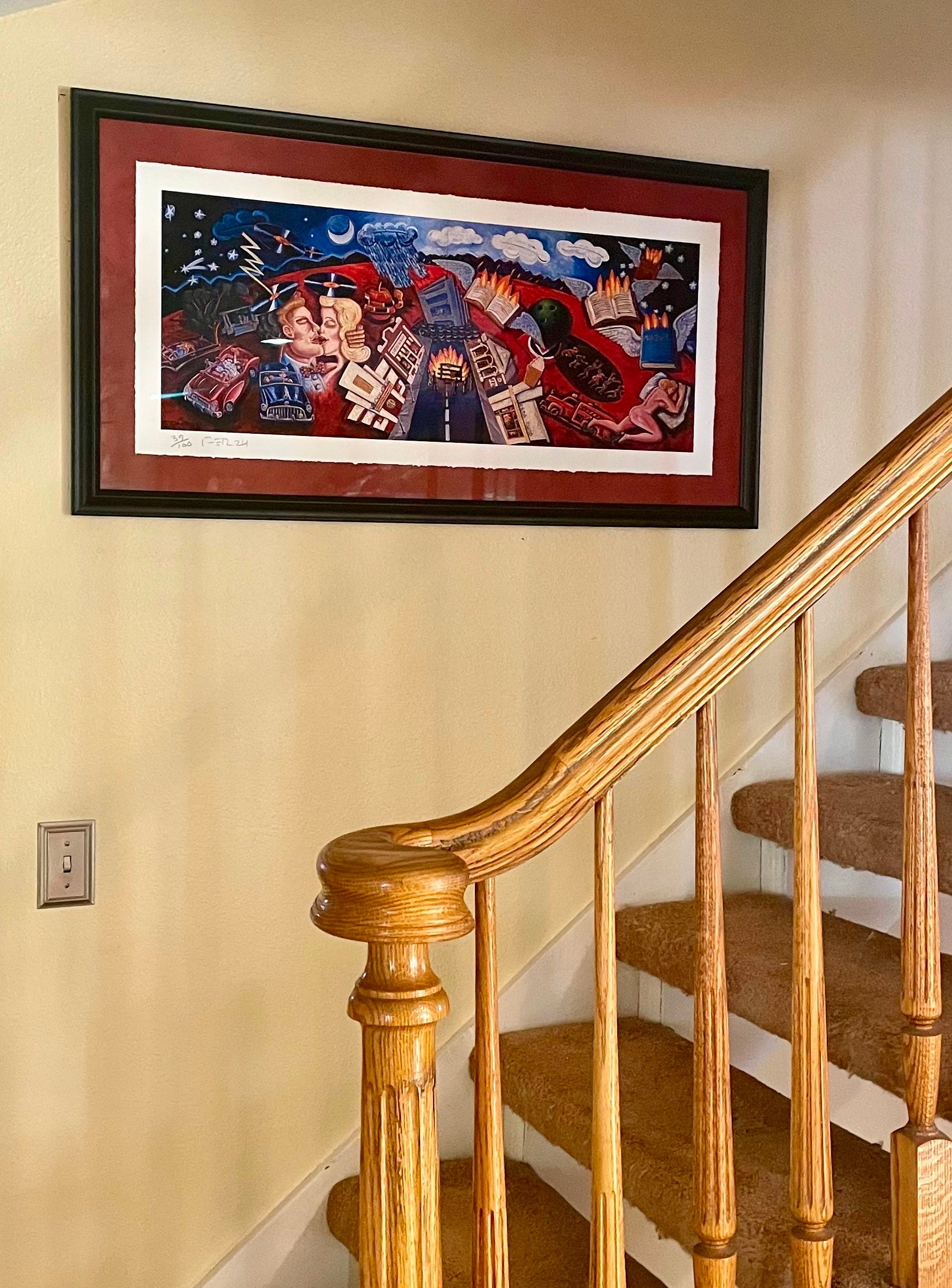 Frank Romero’s “Pleasantville” was offered by the Museum of Latin American Art (MOLAA) as a fund raiser. The original mural was created for the 1998 Academy Award nominated film of the same name, filmed in black and white, except for Romero’s mural.