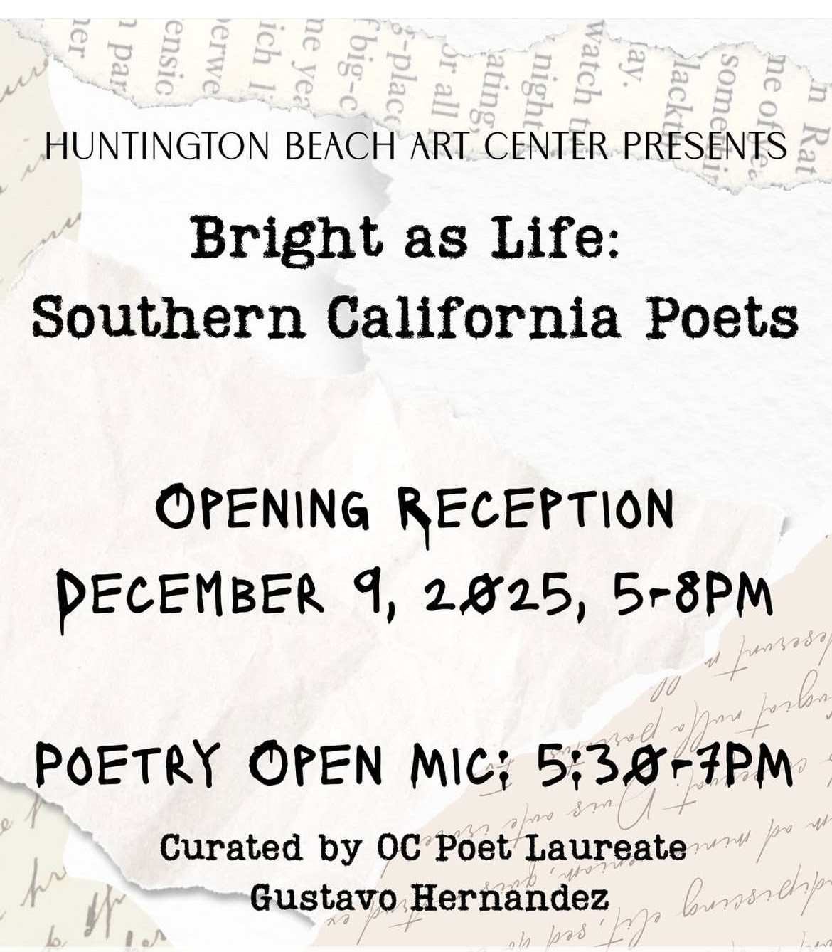 I’m honored that my poem “Power Plant” was selected by Orange County’s Poet Laureate, Gustavo Hernandes, for the upcoming Bright As Life: Southern California Poets exhibition at the Huntington Beach Art Center, 538 Main Street, HB.