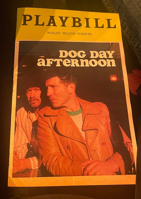 The play we saw that night at the August Wilson theatre, Dog Day Afternoon, was terrific and timely despite being set in 1972. We were twenty years old back then. The young sound and stage design student sitting next to us said he’d just turned twenty-one, was from Hong Kong, didn’t have legal status in the U.S., and planned to move elsewhere once he earned his degree, unless we knew someone willing to pay him under the table.