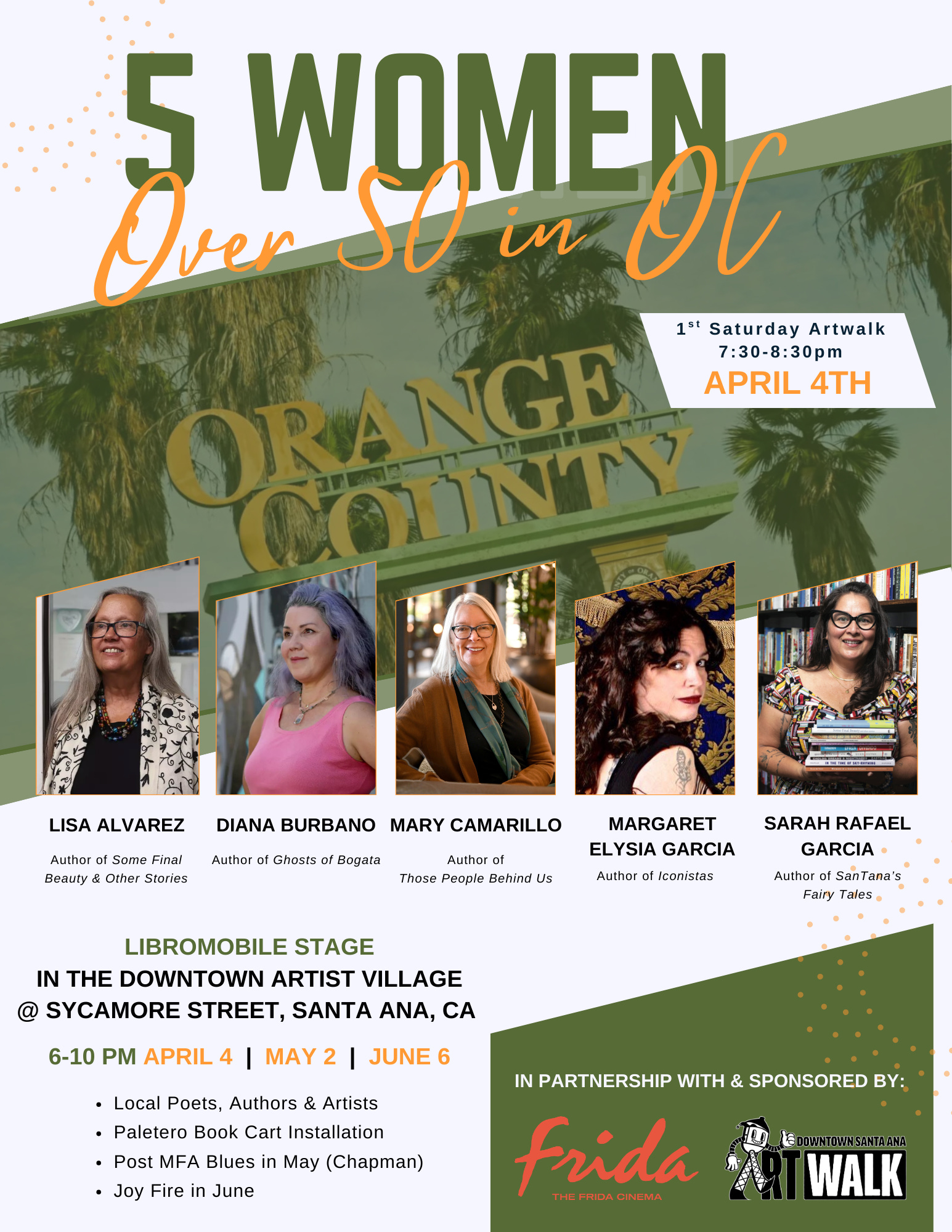 Stay up late with me on Saturday, April 4th for Artwalk in the Artist Village in Santa Ana, California. Stop by the LibroMobile Stage from six to ten p.m. where five women over the age of fifty (including me) will be reading from their work and signing books. It’s the first of a series of events sponsored by LibroMobile that will include poets, authors, and artists.